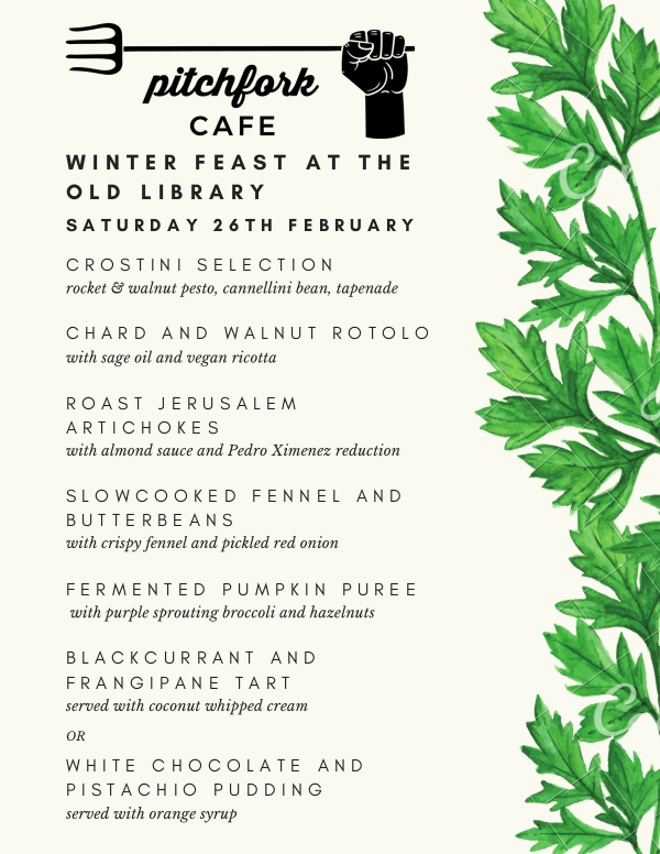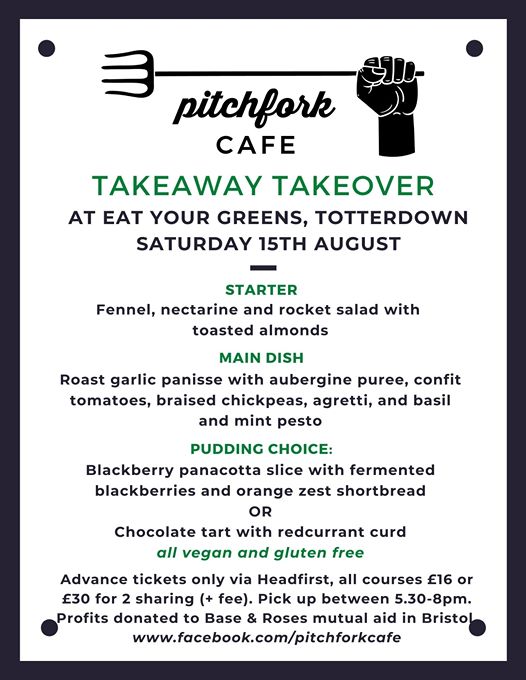 Pitchfork Cafe started up in 2018 with the aim of hosting delicious and affordable, fundraising feasts in the Bristol area. We raised thousands of pounds for different grassroots causes over the years and brought a lot of different people together for evenings of communal eating and discussion. We only put on occasional events now, but have loved the experience gained over the years.